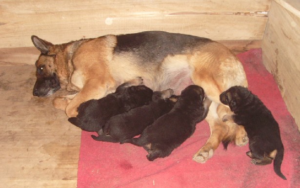 通常在生产后30天至第40天左右的时候,母犬就会渐渐厌烦喂乳,此时母乳的分泌会急速减少,尤其在一胎幼犬数量较多时更会加剧母犬的厌烦。德国牧羊犬母犬的乳房通常是左右各五个,一共十个,少数只有八个或少于八个的。靠后的几个乳房分泌量较多,因此应该适度施以人工干涉,让幼犬交 换吸吮各个乳房,以保证每一只吸乳量平均,发育较差的犬应多吸食分泌量较大的乳房。